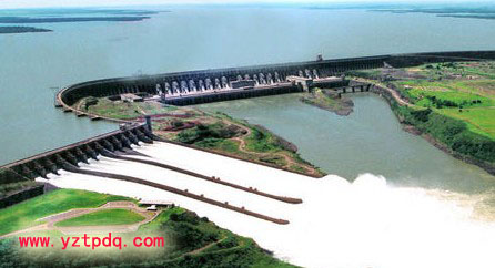 伊泰普水電站位于巴西與巴拉圭之間的界河——巴拉那河(世界第五大河,年徑流量7250億立方米)上,伊瓜蘇市北12公里處,是當(dāng)今世界裝機(jī)容量第二大,發(fā)電量最大的水電站。(裝機(jī)容量最大的是長(zhǎng)江三峽水電站,總裝機(jī)容量將達(dá)到2250萬千瓦,年發(fā)電量為900億度左右。)由巴西與巴拉圭共建,發(fā)電機(jī)組和發(fā)電量由兩國均分。