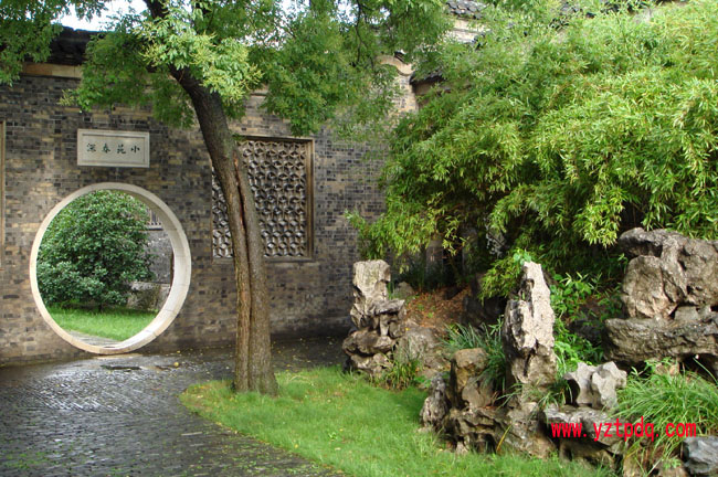 "小苑春深"與"迎曦"兩苑中間有漢白玉月洞門,兩邊有各式水磨磚細花漏窗分隔東西兩園,隔景透景合而為一。站在月門前東望小苑景色,石峰崛起,古柏參天,石榴枝繁葉茂如蓋張。高聳青灰絲縫云山式墻頂如游龍。西看小苑,曲廊幽榭,花廳書齋,牡丹臺上翠竹千竿,花木扶疏,書齋窗前,百年石榴老干如龍蛇走。